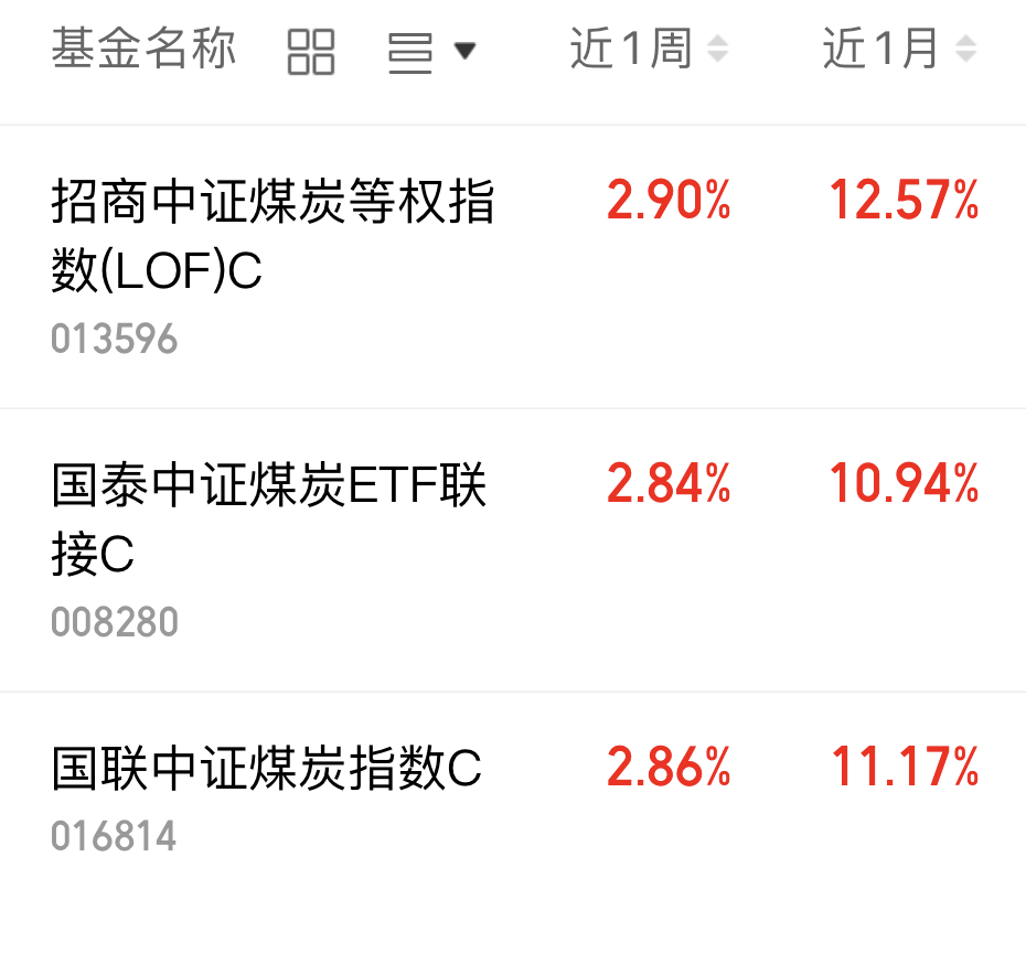 $国联中证煤炭指数C(OTCFUND|016814)$近一周上涨2.86%,近一月上涨11.17%