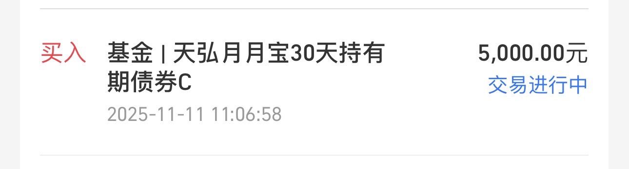 $天弘月月宝30天持有期债券C$ :小王今日上车5000元,这是一只稳健的纯债基金,回撤控制得十分优秀,昨天也是稳稳两个蛋,我觉得表现还是很不错的;从最新的第三季度持仓来看,信用债占比113.61%,配备的6.12%的利率债去进攻收益,该基金聚焦金融债和短期融资券,短期融资券配置侧重高流性品种基金,经理也是严格控制回撤基础上再去追求较好的收益,所以目前进成立未满一年的收益率就已经达到了2.17%,而其最大回撤只有0.10%,所以该基金收益回撤比控制十分到位,对于该基金我根本不担心回调的到来,所以我已经把该基金作为我的底仓基金,底仓基金一定要稳,这样才方便我就进攻收益,所以我觉得该基金总体还是很不错的,今日我准备建个底仓啦