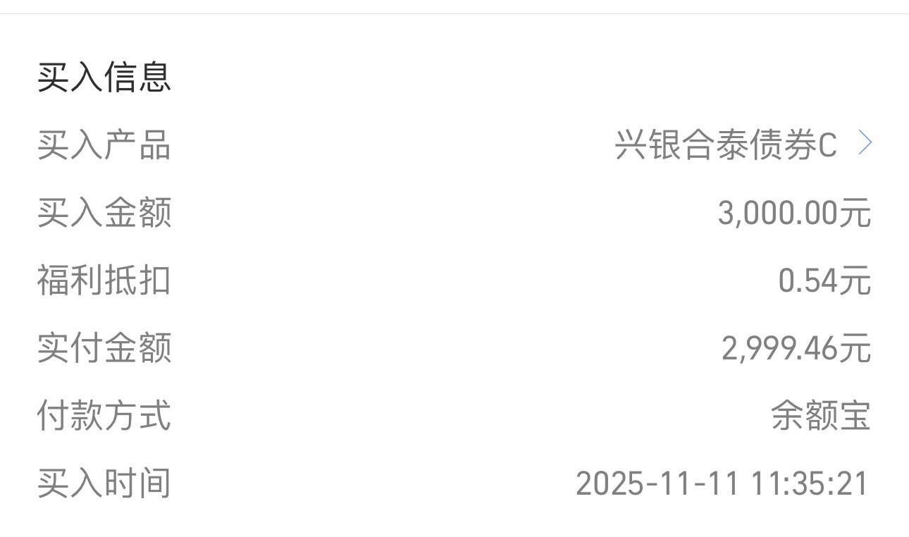$兴银合泰债券C$ :小王今日红包3000-0.75上车,我觉得这是一只弹性较大的纯债基金,在此次回暖中,它也展现出了较好的回撤修复能力,再加上今年纯债行情回调的幅度比较大,所以我觉得后续今年应该还会有的补涨空间,所以我更加看好这个纯债基金,从最新的第三季度持仓来看:信用债占比109.16%,利率债占比11.66%,两者持仓相辅相成也比较容易实现风险的对冲,并且拉开长期收益来看:近一年收益率达到3.53%,而且最大回撤只有0.83%,收益回撤比控制比较到位,最重要的一点还是因为我比较看重这个基金的潜力,所以我准备继续上车3000