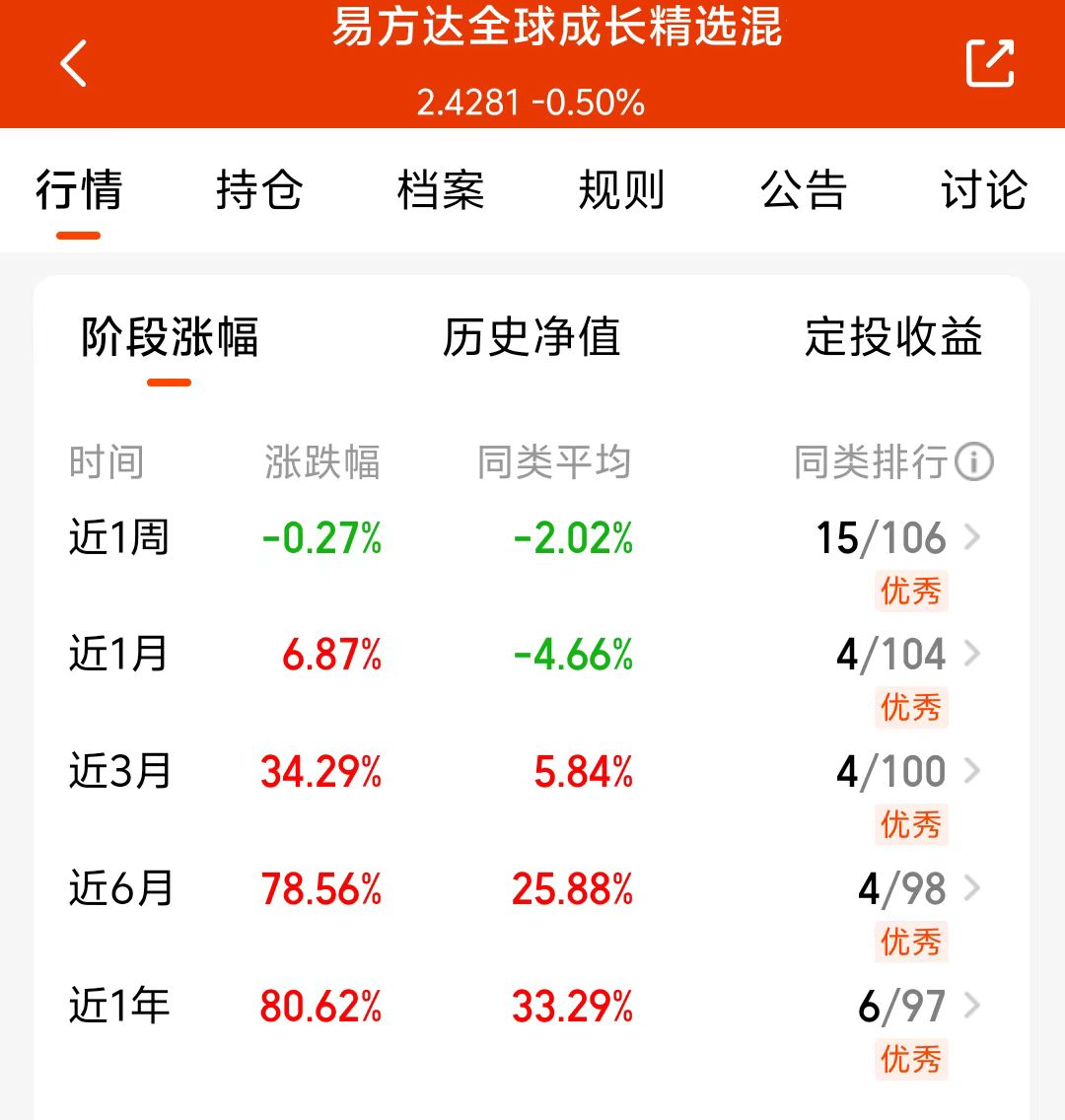 大盘今天震荡调整,港股今天也回调了,美股昨夜涨了不少,近期市场波动比较大,轮动起来还是很快的,单一市场容易踏空,风险比较大,易方达全球成长精选混合C持仓可投全球科技板块,美股、港股和A股都能投,近六个月涨了78.56%,还是历史绩优低回撤榜一,回撤也控制的很好,我准备分批加仓了!