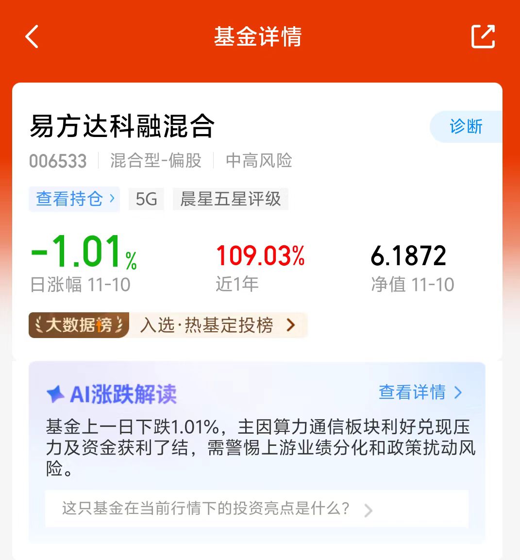 大盘今天震荡调整,近期市场波动加剧,成长行情各大板块轮动很快,易方达科融混合持仓比较均衡一些,持仓有科技、新能源和军工板块,近六个月涨了107.56%,回撤也控制的不错,能涨抗跌,经理调仓能力不错,我准备分批加仓了!