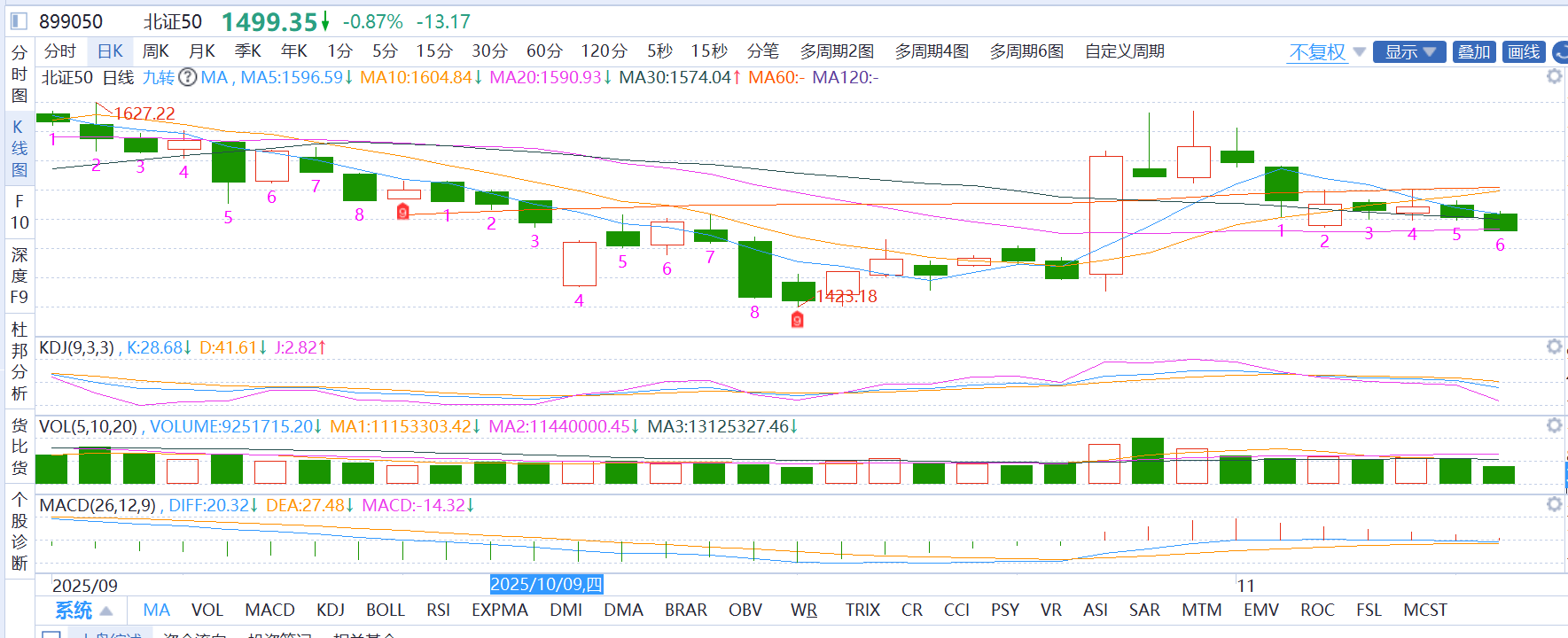 北证50:麦爸认为目前震荡下跌,围绕1500点整数关口震荡,成交量平淡,但政策预期(北证50ETF筹备)支撑长期价值。麦爸选择躺平,市场热点快速轮动中,小盘股风格仍有表现机会,耐心等下一波行情。
