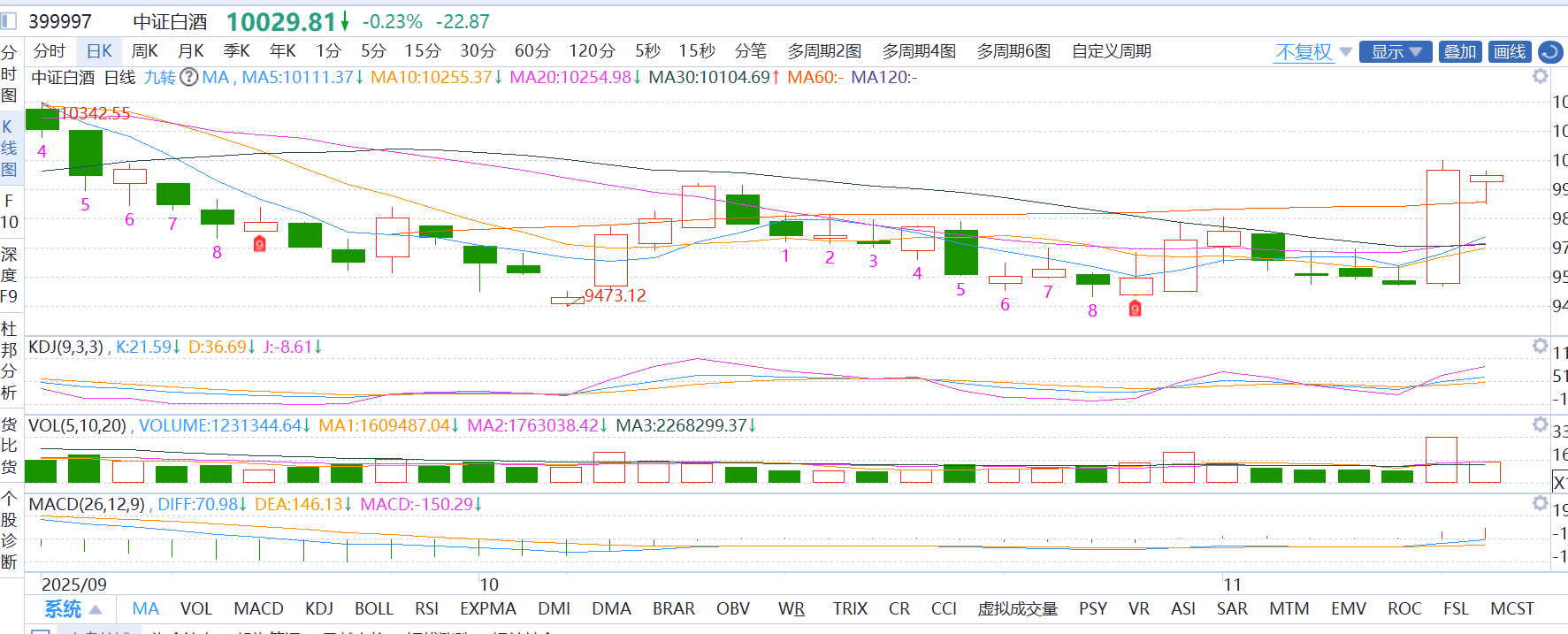 白酒板块:麦爸认为目前白酒昨日消费股爆发后今日转弱,量能不足,短期均线拐头向下。麦爸选择保持观望,不动!
