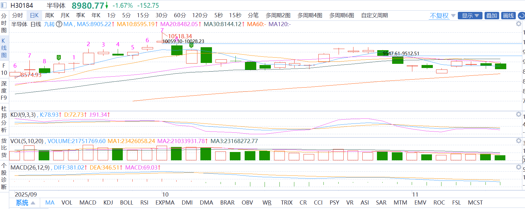 半导体:麦爸认为目前受美股存储芯片大涨刺激,但A股跟涨乏力,技术面承压均线,MACD弱势。低位有企稳迹象,但麦爸还是坚持认为中长期仍是科技主线之一,技术面也存在反弹空间。麦爸今日选择低吸。