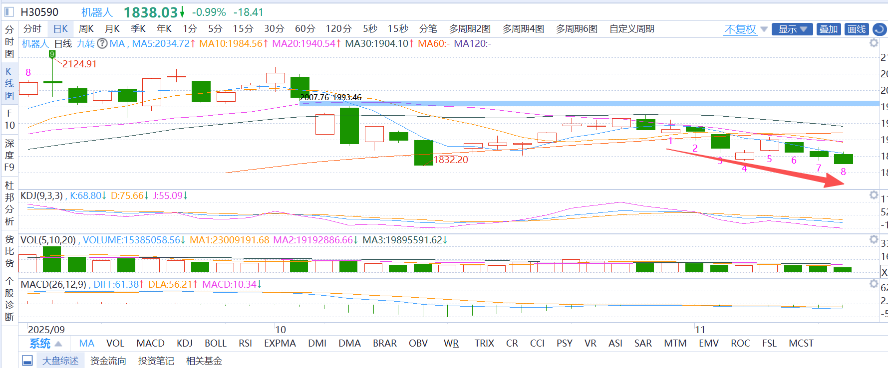 机器人板块:麦爸认为目前技术面KDJ拐头向下,缺乏量能支撑。但麦爸觉得最近消息面利好,不应该这样,大概率是洗盘ing,等待放量突破20日均线,麦爸还是继续持仓等待上涨。