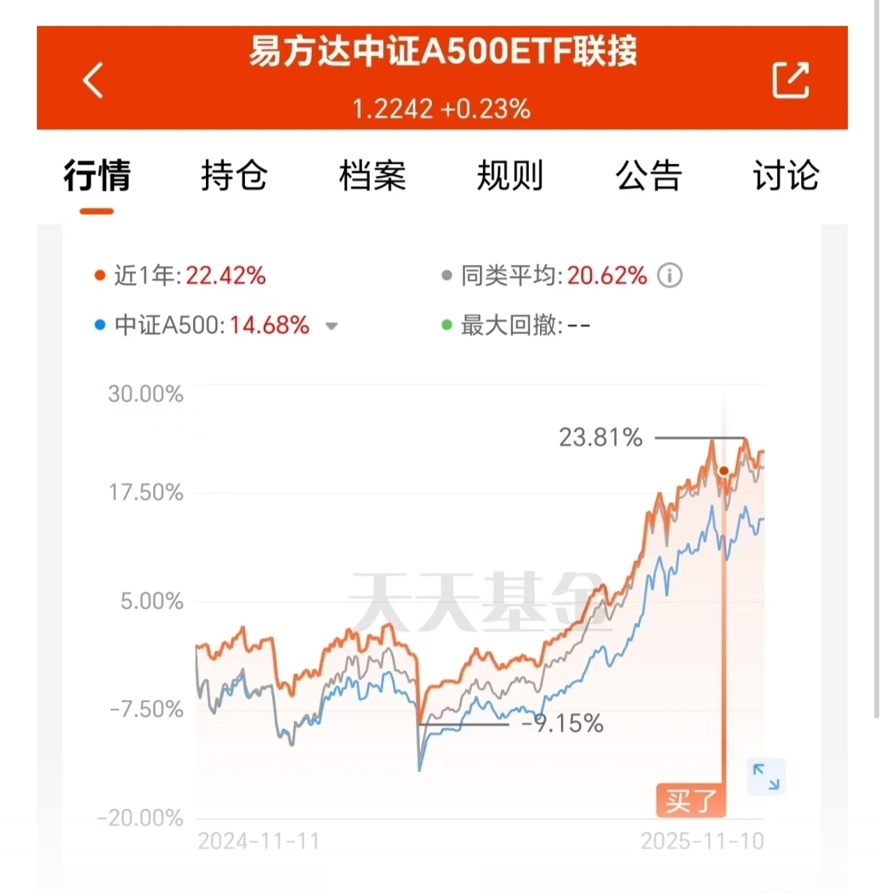 今天市场走得不太稳,沪指在4000点附近来回晃荡,看着都让人心慌。最近板块轮动太快了,根本跟不上节奏,我自己瞎折腾追涨杀跌,结果差点把赚的钱都赔进去,真是吃了个大亏。看看中证A500指数,今年都涨了20%多了,比我瞎操作强多了。现在想通了,与其天天猜哪个板块会涨,不如老老实实跟着易方达中证A500ETF联接C(OTCFUND|022460)这样的产品走,至少能稳稳当当地跟着市场趋势走,不用整天提心吊胆的。