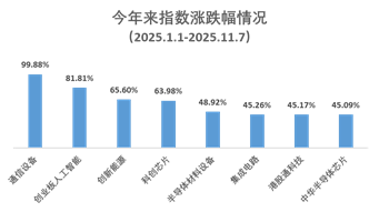 首先,科技板块前期涨幅过大,导致技术性回调压力积聚。自今年初以来,以AI、算力、半导体为代表的科技板块毫无疑问是市场上最亮眼的主线,积累了巨大的涨幅。以通备、创人工智能、科创芯片指数为例,截止11月7日,今年来通信设备涨幅达99.88%,创业板人工智能指数涨幅达81.81%,科创芯片指数涨幅近64%。在累积如此大涨幅的背景下,市场存在获利了结需求实属正常。今日的调整,或许更多是市场内部技术性修整需求的集中释放。