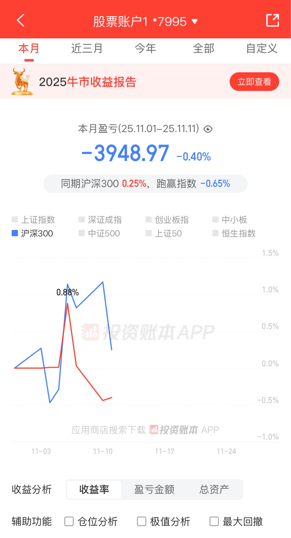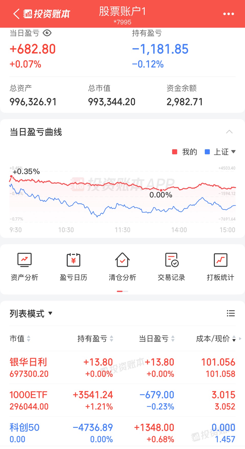 今日账户盈利:683 元。 11月11日,A股三大指数今日集体下跌,截至收盘,上证指数跌0.39%,深证成指跌1.03%,创业板指跌1.4%,北证50跌1.02%。沪深京三市全天成交额20139亿元,较上日缩量1805亿元。全市场超2700只个股逆势飘红。 ETF收盘涨跌不一,港股汽车ETF(520600)领涨2.38%,港股通汽车ETF(159323)涨2.23%,香港汽车ETF(520720)涨2.01%。通信ETF(515880)领跌3.11%,创业板人工智能ETF国泰(159388)跌2.93%,通信设备ETF(159583)跌2.88%。