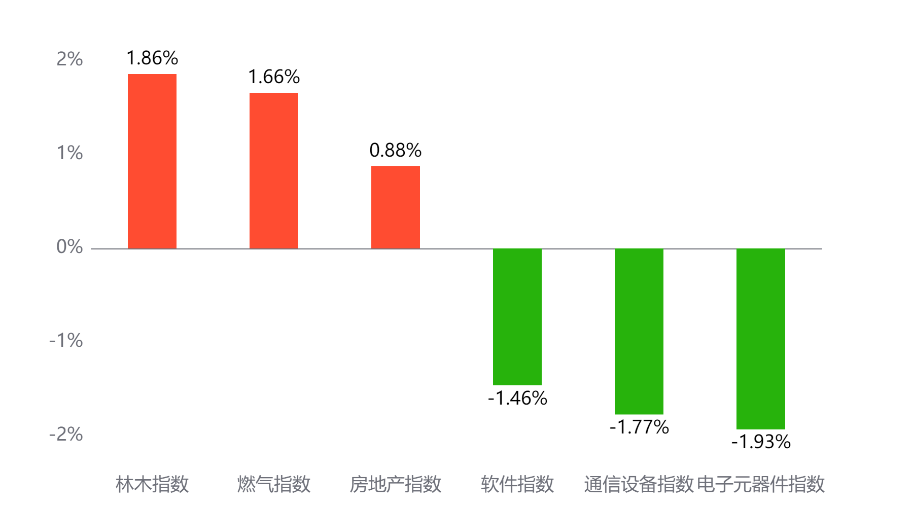 今天表现最好的主题概念依次为林木、燃气、房地产,表现最差的依次为软件、通信设备、电子元器件。