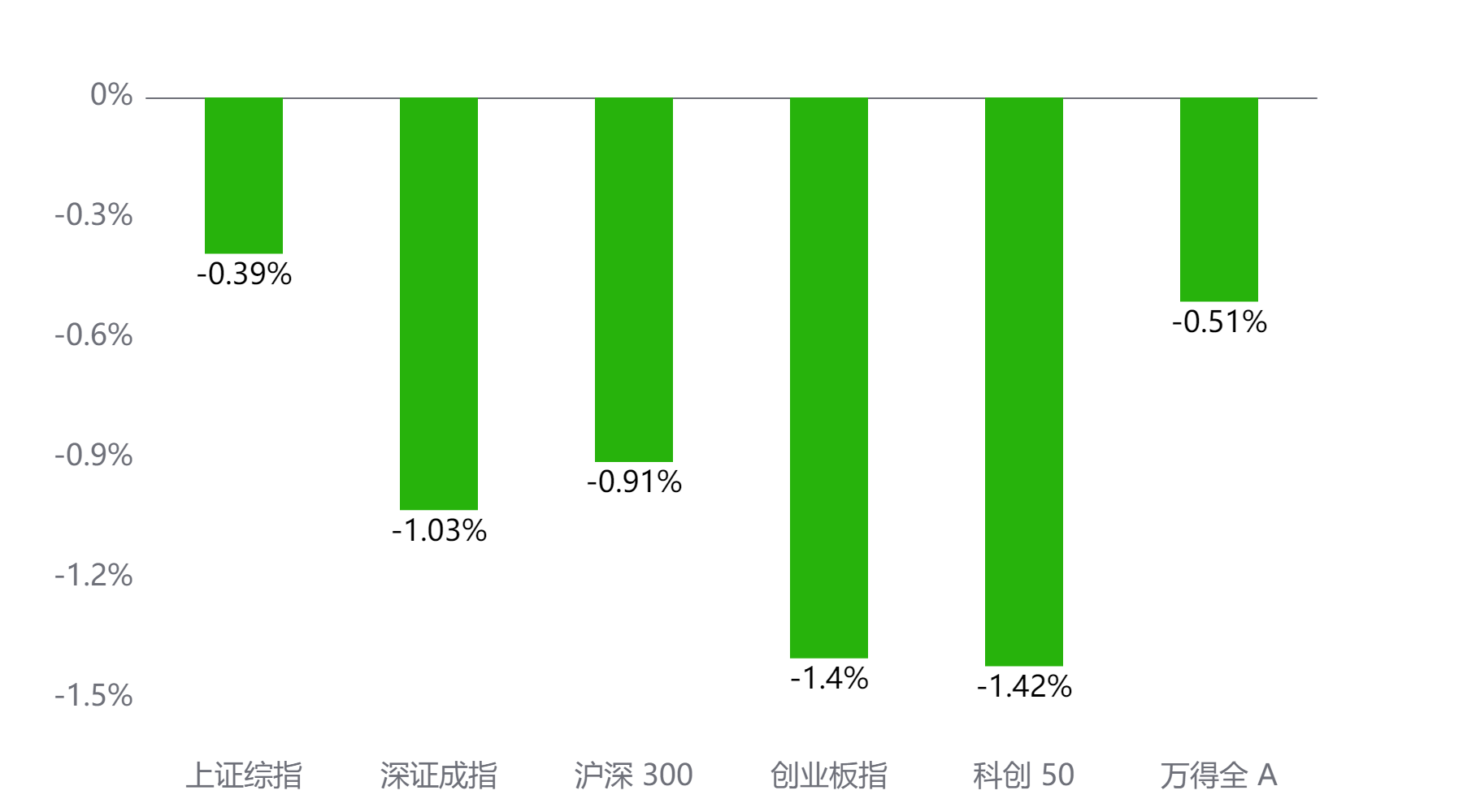 截至今日收盘,市场各主要指数普遍下跌。上证综指收4002.76点,下跌0.39%;深证成指收13289.0点,下跌1.03%;沪深300下跌0.91%,创业板指下跌1.4%,科创50下跌1.42%,万得全A下跌0.51%。