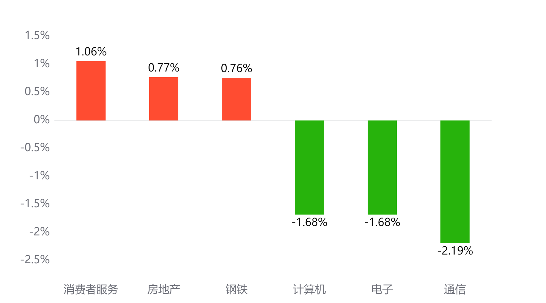 今天表现最好的行业板块依次为消费者服务、房地产、钢铁,表现最差的依次为计算机、电子、通信。