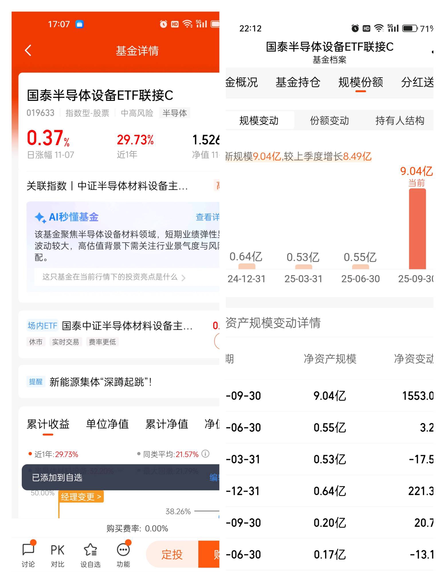 我一直关注宝藏基--国泰半导体设备ETF联接C(019633)这只基金,11月6日大涨3.05%,冲劲十足,我想择机买入。我看到基金规模在不断攀升,三季度较前一季度增长了1553.05%,受到投资者追捧;这只基金基于国泰基金对半导体行业投资机会的精准把握,今年以来收益回报率42.58%,为国泰基金公司出色的管理能力点赞!
