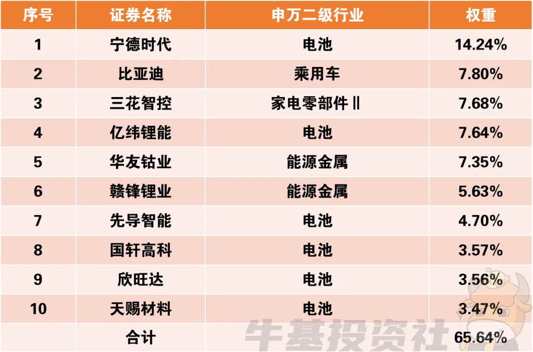 指数前十大成份股包括宁德时代、比亚迪、亿纬锂能等行业巨头,合计权重达65.64%,覆盖电池、材料、设备等关键环节。