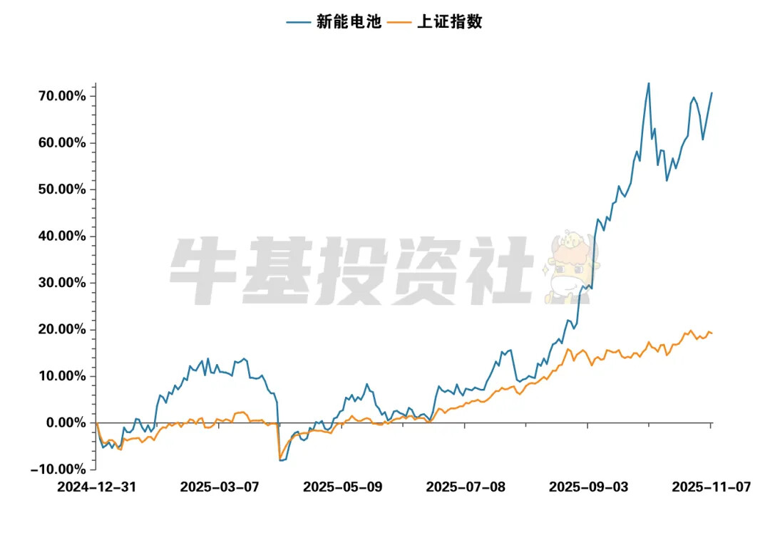 这意味着,对消费者来说,购买一辆30万元的新能源车,成本将增加约1万多元。而对车企来说,四季度是享受政策红利的最后窗口期,谁能拿到更多电池、造出更多车,谁就能在年终冲刺中占据先机。这场由政策切换引发的“末班车效应”,正推动整个产业链进入高景气周期。伴随着电池行业景气度的提升,股市中电池板块表现也十分抢眼。以国证新能源车电池指数(简称:新能电池)为例,该指数今年以来涨幅超过70%,展现出较高的收益弹性。$广发国证新能源车电池ETF联接C(OTCFUND|013180)$