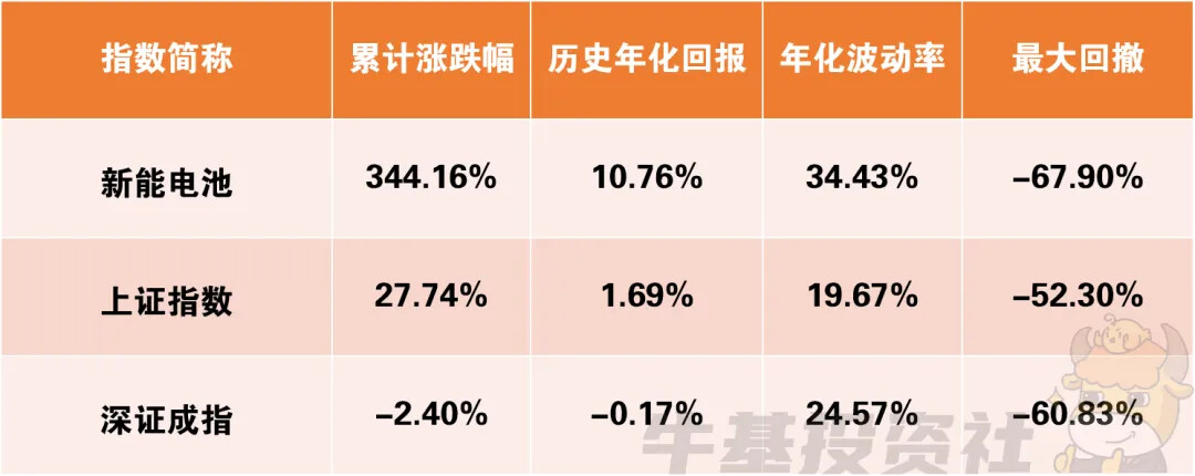 国证新能源车电池指数过去15年累计涨幅344.16%,历史年化回报10.76%,超越同期上证指数和深证成指的表现。与此同时,由于指数弹性较大,其历史波动率和最大回撤也更高。