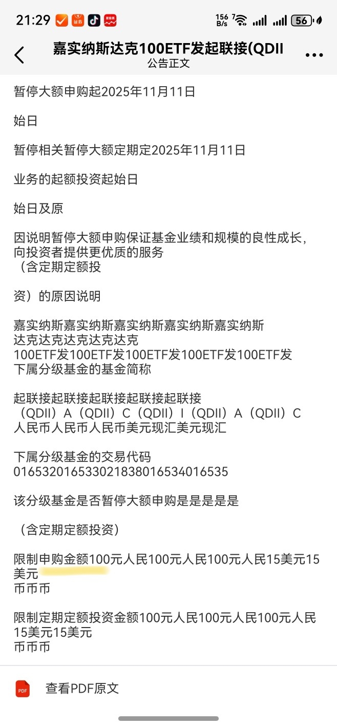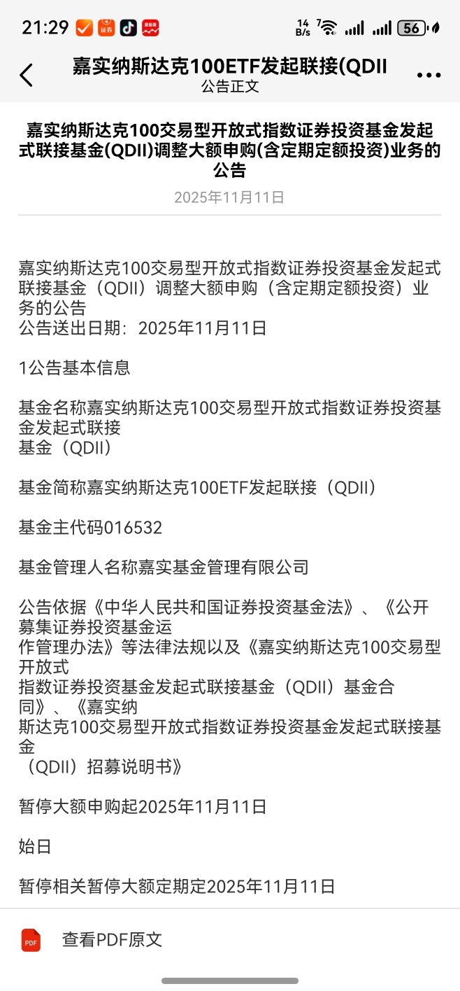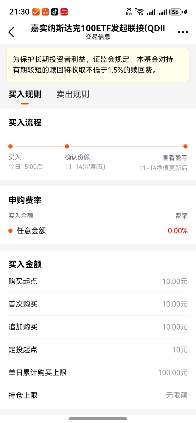 在今天晚上的时候,观察在以前买的某实纳斯达克100指数qdll基金。从今天11与