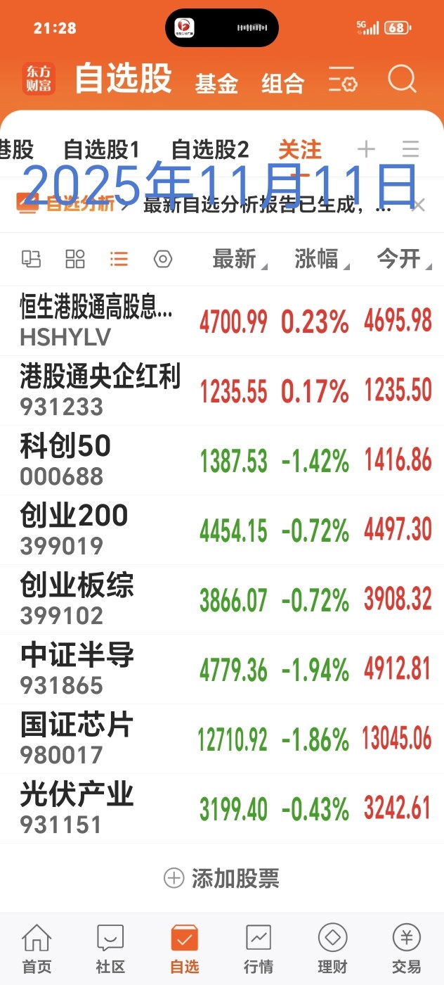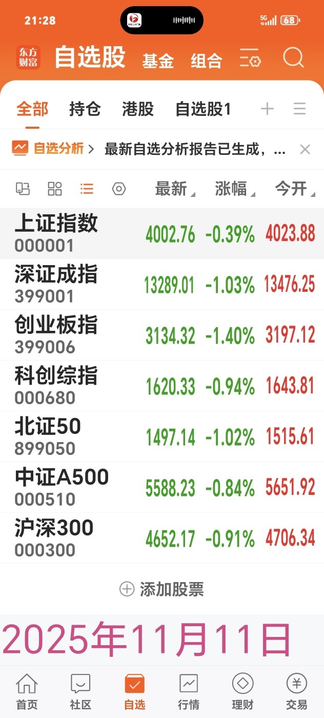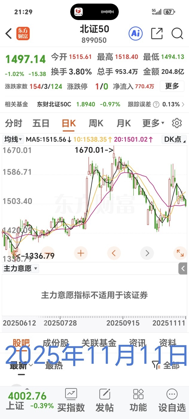 今日沪、深、北三个市场五个主要综合指数全部下跌,其中创业板指领跌,跌幅达到1.4%,日K线方面,这五个指数也全部收于阴线,其中科创综指己连收3根阴线,深证成指、创业板指和北证50连续2根阴线,同时北证50今天低点己下穿20日均线,下跌趋势己十分明显。鉴于以上行情,近期以持币观望为宜,北证50如遇反弹,则适当减仓。