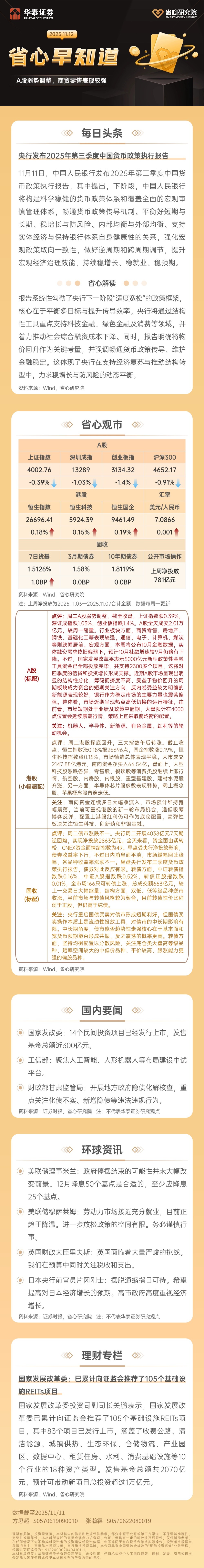 周二A股弱势调整,截至收盘,上证指数跌0.39%,深证成指跌1.03%,创业板指跌1.4%。A股全天成交2.01万亿元,较周一缩量。行业板块方面,商贸零售、房地产、钢铁、基础化工等表现较强,通信、电子、计算机、煤炭等则跌幅居前。宏观方面,本周将公布10月金融数据,实体融资需求依旧偏弱下,预计10月社融增速较9月仍略有下降。不过,国家发展改革委表示5000亿元新型政策性金融工具资金已全部投放完毕,共支持2300多个项目,这将对四季度的信贷和投资增长形成支撑。近期A股市场呈现出明显的结构性分化,筹码拥挤度不高、受益于物价回升的周期板块成为资金的短期关注方向,反内卷受益较为明确的新能源表现较好,银行作为稳定市场的主要力量也震荡偏强。整体看,市场近期呈现热点高低切换的运行特征。往前看,市场短期处于业绩及政策空窗期,大盘预计在4000点位置会延续震荡行情,策略上宜采取偏均衡的配置。
