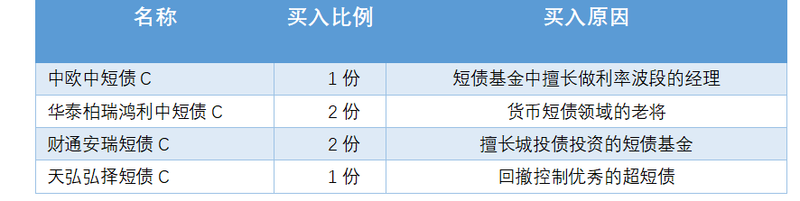 从发车的标的来看,在短债基金之中,我们也选择了较为丰富的搭配。既有擅长利率交易的基金经理,也有擅长城投债投资的短债基金。另外,我们也分别卖出了此前持仓的2份长久期利率债,将份额加到了本期发车的短债上。