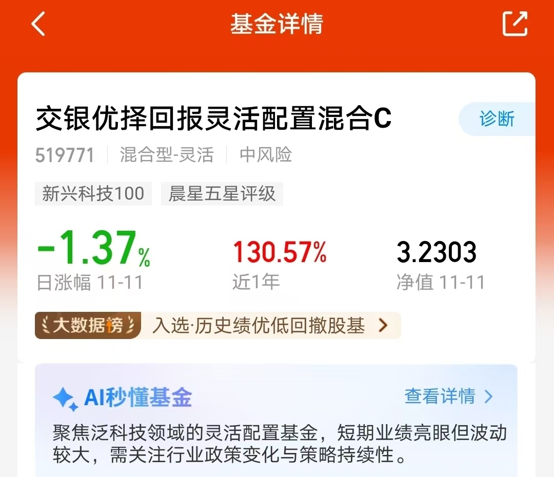 优择回报C近一年涨130.57%真顶!把大盘和同类都甩老远,重仓的科技方向刚好是当下主线。今天小跌不用慌,11月行业大会、技术升级都在发力,它灵活调仓的优势刚好能跟上节奏,后续行情值得期待。