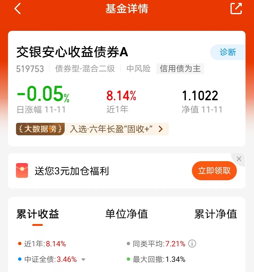市场震荡下“固收+”产品备受青睐,六年长盈认证的标的更显靠谱,成为求稳者的心头好。这只“固收+”近1年赚8.14%,信用债筑牢根基、权益端添收益,表现优于同类平均,今日小跌属正常,1.34%最大回撤+中风险,后续有望持续稳健上涨。$安信深圳科技指数(LOF)C$ $大成中证电池主题指数发起C$ $泰康香港银行指数C$
