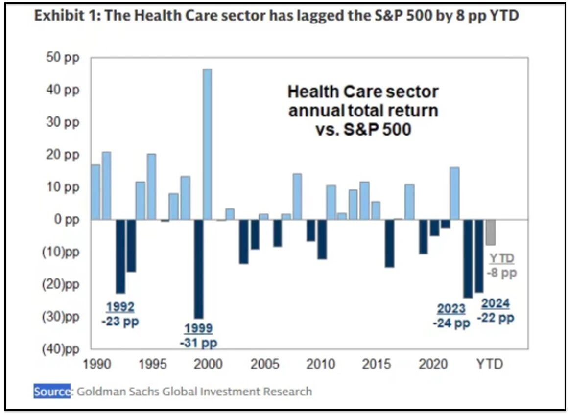 具体来说,像过往长牛的生物医药,下图,过去三年,分别大幅跑输标普500,24%、22%、8%,这在历史上,也是很少出现的。