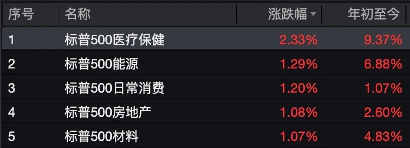 昨晚最大的变化在于,在科技板块下跌的同时,避险板块乘上了跷跷板,反而上涨。昨晚,美股领涨的板块,包括生物医药、消费、地产、能源、金融等“老登板块”,或者说,防御类板块,而这些板块,都是今年以来,涨幅落后的行业,下图。
