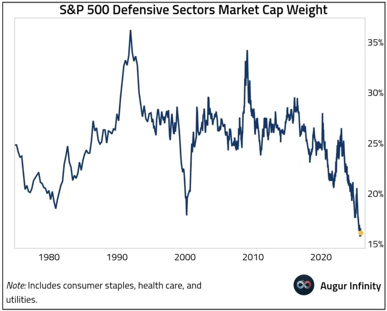 事实上,在最近几年,特别是23年的ChatGPT出现后,由于科技板块的攻势凌冽,这些防御类板块(Defensive Sectors)在标普500的权重,已经降到了历史的最低位附近,下图。