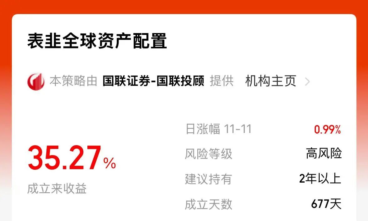 截止昨日,成立以来收益35.27%。想一起跟投「表韭全球资产配置」的小伙伴,在天天基金搜索,「表韭」,就能看到结果了。