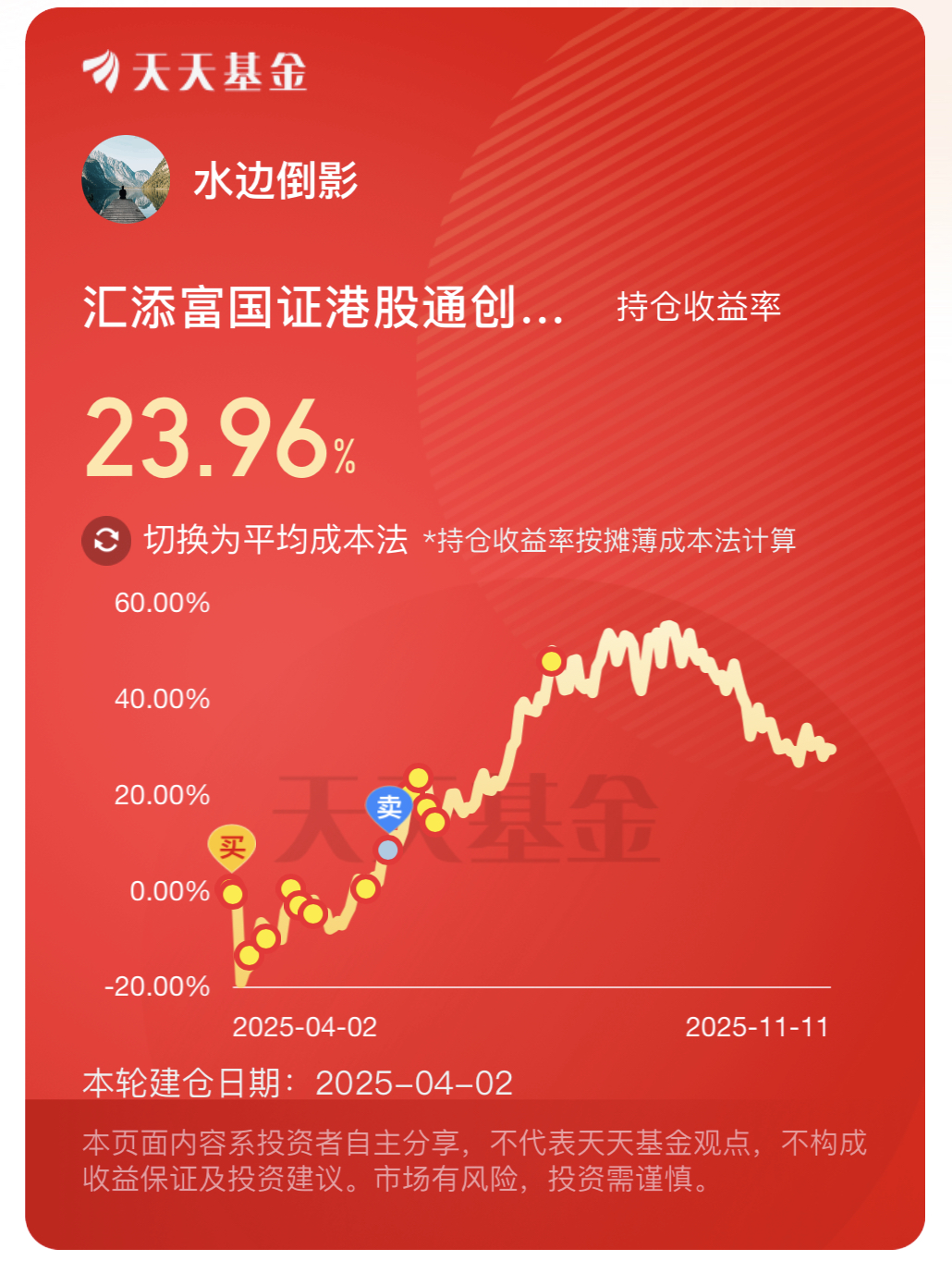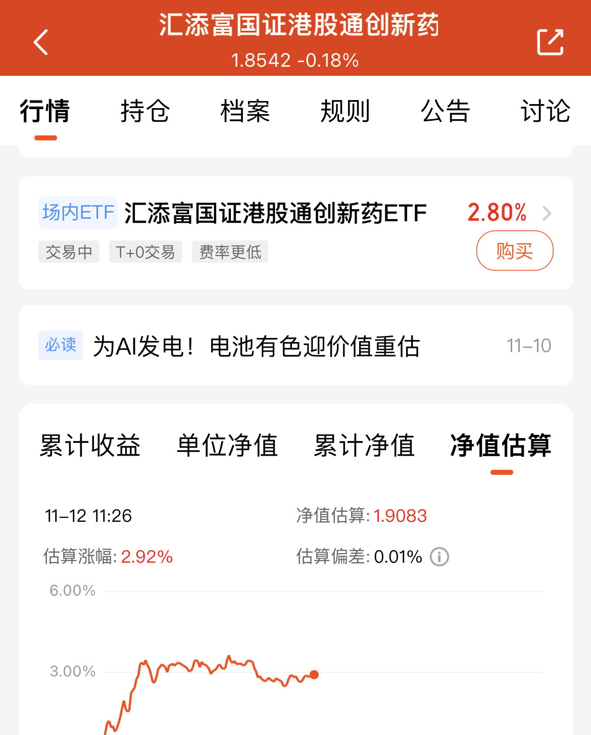 今天创新药板块大涨反弹,我手里的$汇添富国证港股通创新药ETF发起式联接C(OTCFUND|021031)$,持仓收益都23.96%了!近半年涨35.69%,近一年更是超61%,业绩这么给力,趁着这波反弹行情我接着加仓布局。