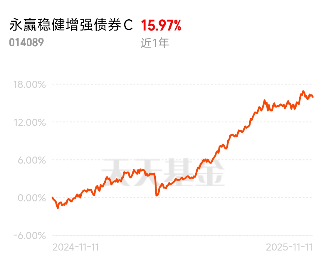 ,近一年15%的收益就能看出这个固收+策略还是挺强的,进可攻退可守,持有也很省心,也适合新手小白同学,不用天天盯着看,适当入手一些还是挺不错的$永赢稳健增强债券C$