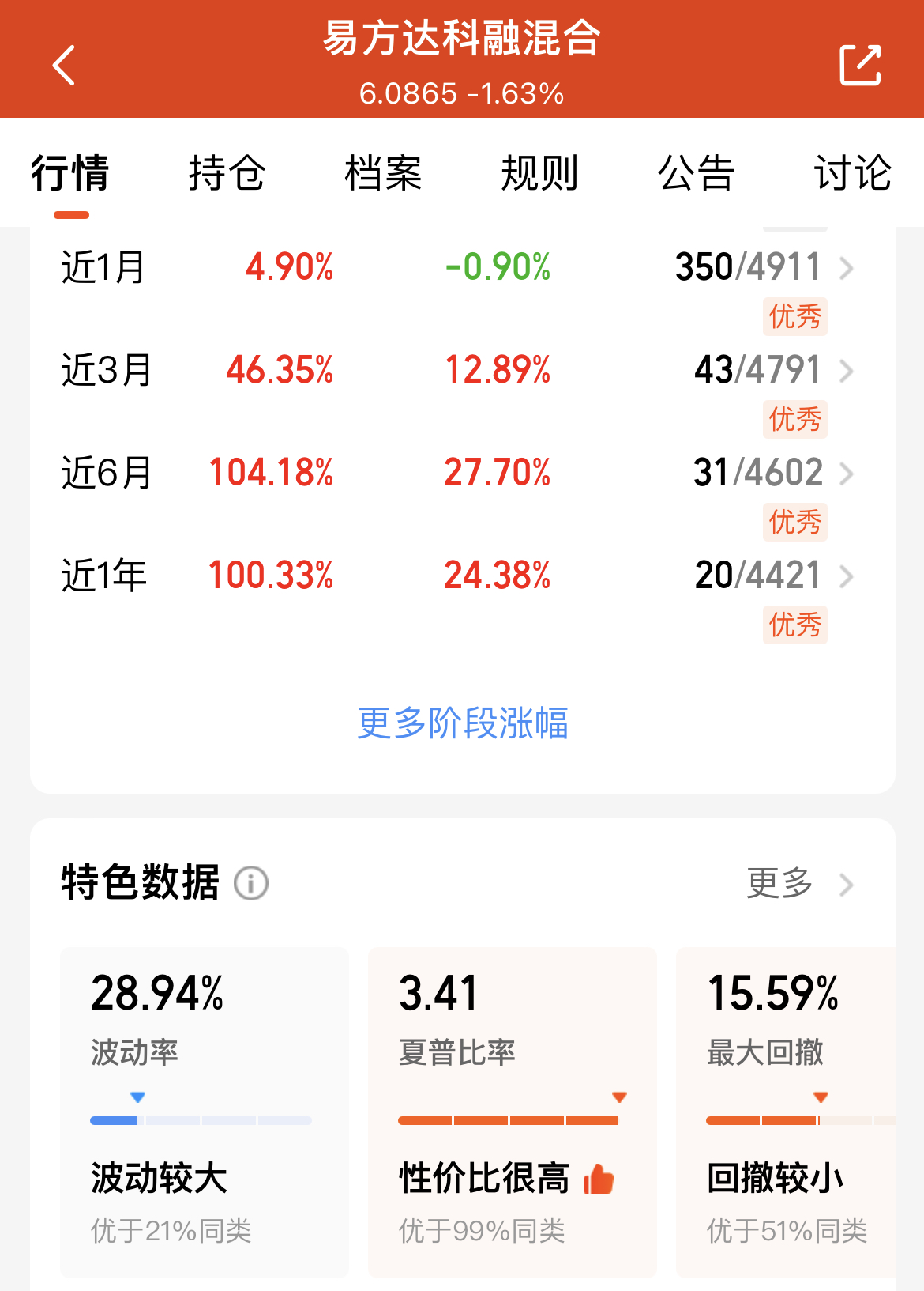 今天大盘低开后反弹,午盘又回落了,板块轮动快得让人抓不住,单一赛道又怕踏空又怕套。易方达科融混合就很适合,它布局了科技、军工、新能源这些高潜力板块,不用追着轮动跑。近一年涨幅100.33%,还能靠调仓控住回撤,这种均衡配置在当前行情里既稳又能吃红利,我准备分批布局起来。