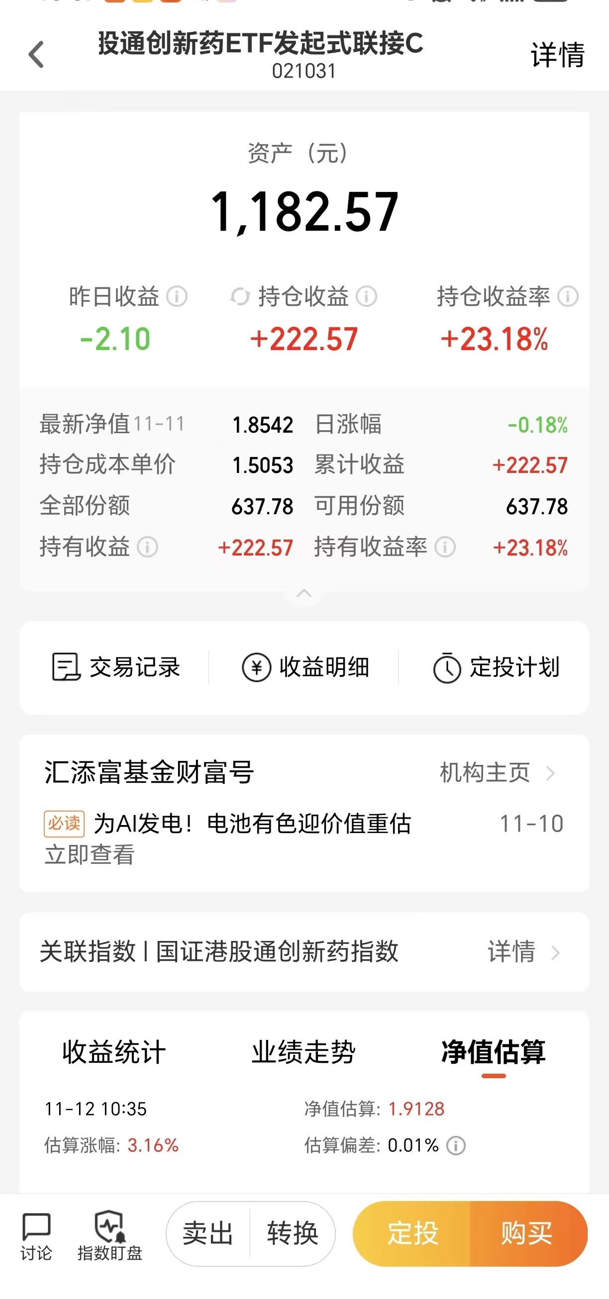 目前创新药板块仍处于底部修复行情,$汇添富国证港股通创新药ETF发起式联接C(OTCFUND|021031)$ 100%纯度,弹性更强,个人持有收益率23.18%,继续持仓待涨。