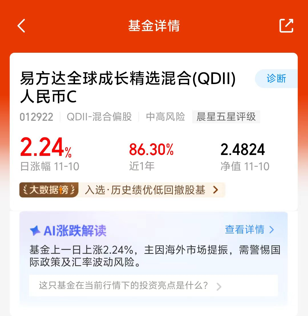 美股昨夜震荡调整,三大指数涨跌不一,大A今天又调整了,港股近期也回调了,全球市场近期波动比较大,单一市场容易踏空,易方达全球成长精选混合C持仓可投美股、A股和港股科技板块,灵活把握多个市场科技成长机遇,近一年涨了86.30%,业绩还不错,我准备分批布局了!