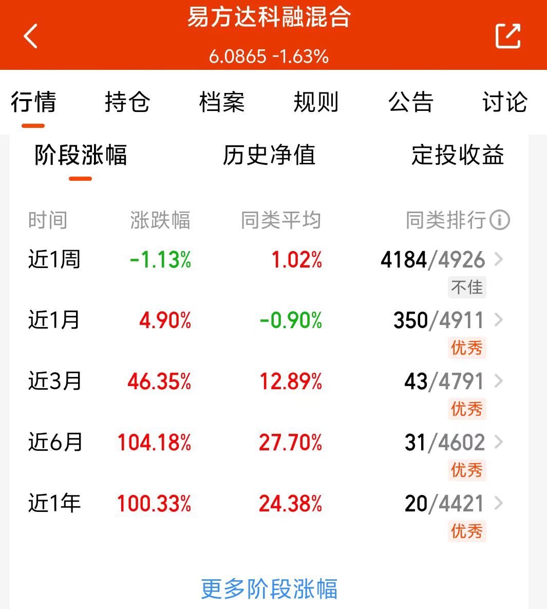 大盘今天震荡调整,科技板块回调了,近期市场波动加剧,各大板块轮动速度很快,易方达科融混合持仓聚焦A股+港股,持仓有科技、新能源和高端制造等板块,近六个月涨了104.18%,能涨抗跌!易方达科讯混合持仓聚焦A股,和科融是一个策略,近六个月涨幅也超100%了,看好这个方向,我准备分批加仓了!