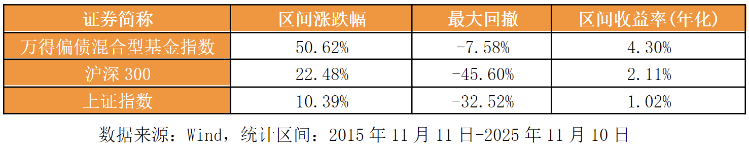 历史数据显示,过去10年,偏债混合型基金指数的涨幅为50.62%,区间收益率(年化)达4.30%,优于同期沪深300和上证指数的表现,同时,最大回撤相对可控,整体为投资者带去了较稳的投资体验。