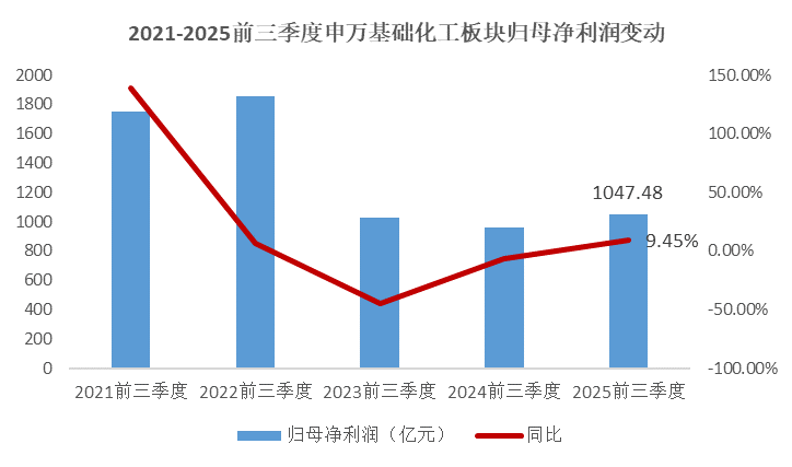 2025年前三季度基础化工子行业归母净利润同比增速