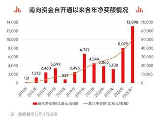 近期,港股市场迎来了新的里程碑,据财联社数据,截至11月11日,南向资金年内净买入额突破1.3万亿港元,为去年全年的1.6倍,自港股通开通以来的累计净流入规模也突破5万亿港元,刷新互联互通机制开通以来的最高纪录。