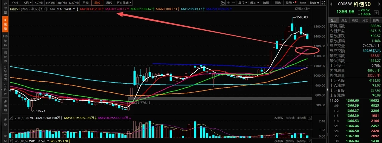 现在大家去看下面两张图,分别是创业板指数还有科创50指数周线图,周线级别一旦跌破10周均线的支撑, 那么创业板指数的20周均线的位置是在2800点附近,科创50指数的20周均线的位置是在1260点附近。