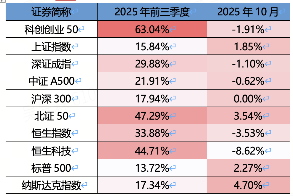 数据来源:wind,统计区间:2025/01/01-2025/10/31,指数名称(代码):科创创业50(931643.csi)、上证指数(000001.sh)、深证成指(399001.sz)、中证A500(000510.sh)、沪深300(000300.sh)、北证50(899050.bj)、恒生指数(hsi.hi)、恒生科技(hstech.hi)、标普500(spx.gi)、纳斯达克指数(ndaq.o)。指数过往业绩不预示未来表现。