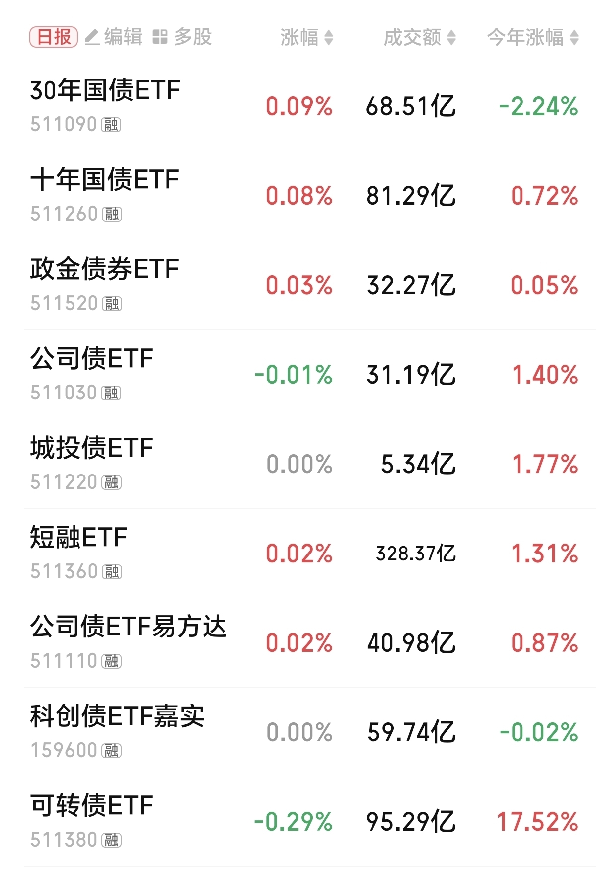 债券ETF共计53只,按照利率债、信用债、可转债分类,头部有代表性的债券ETF有9只,合计规模占整个债券ETF五成以上。7年以上长久期利率债上涨,30年国债ETF上涨0.09%;新发的信用债、科创债略好于公司债、城投债。从整个债券ETF来看,利率债全部上涨,信用债涨跌互现。