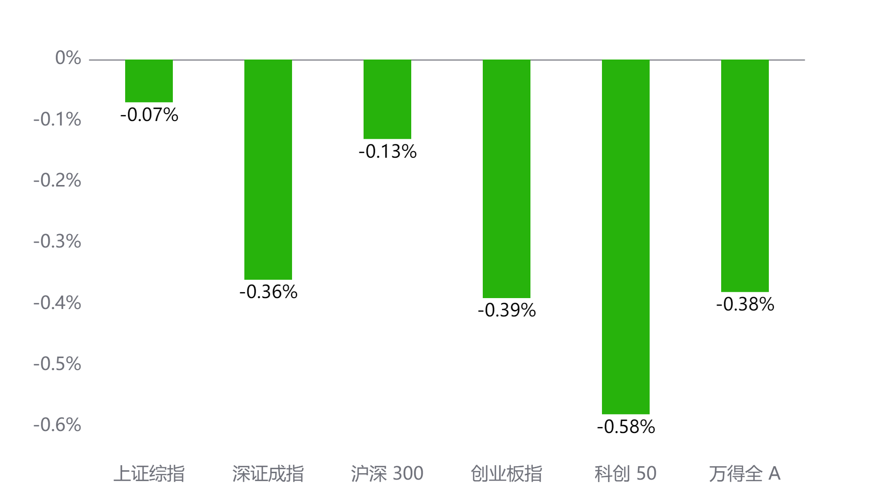 截至今日收盘,市场各主要指数普遍下跌。上证综指收4000.14点,下跌0.07%;深证成指收13240.62点,下跌0.36%;沪深300下跌0.13%,创业板指下跌0.39%,科创50下跌0.58%,万得全A下跌0.38%。