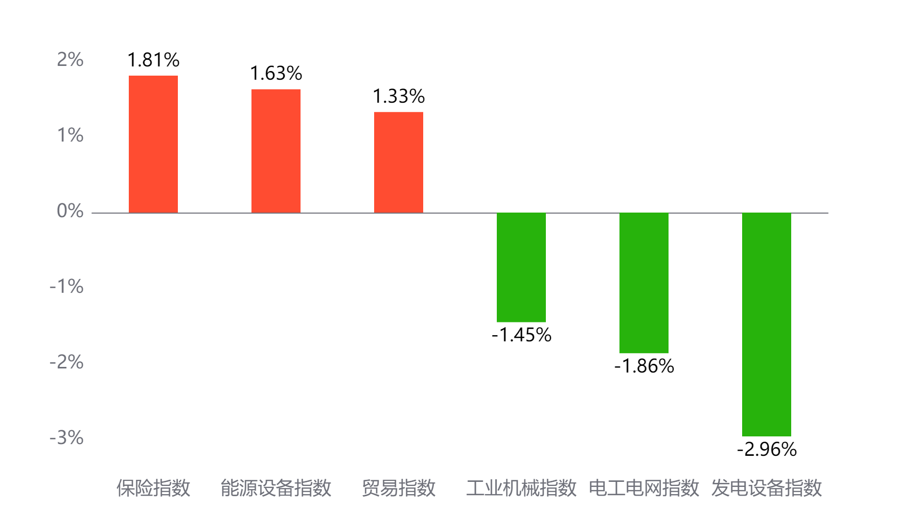今天表现最好的主题概念依次为保险、能源设备、贸易,表现最差的依次为工业机械、电工电网、发电设备。