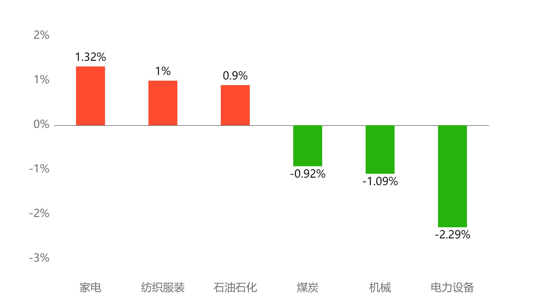 今天表现最好的行业板块依次为家电、纺织服装、石油石化,表现最差的依次为煤炭、机械、电力设备。