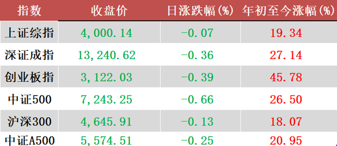 国内主要股指普跌。截至收盘,上证指数跌0.07%,收报4000.14点;深成指跌0.36%,报13240.62点;创业板指数跌0.39%,收报3122.03点。两市成交额19450亿元。行业方面,申万一级涨少跌多,家用电器领涨,涨幅为1.22%;电力设备领跌,跌幅为2.1%。