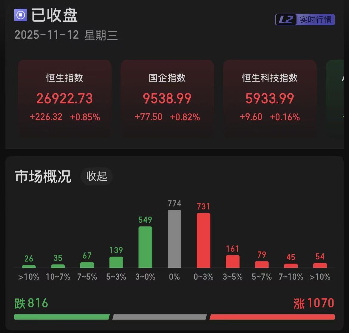 恒生指数上涨0.85%,国企指数上涨0.82%,恒生科技指数上涨0.16%。1070只个股上涨,816只个股下跌。南向资金,净买入42.86亿港元。