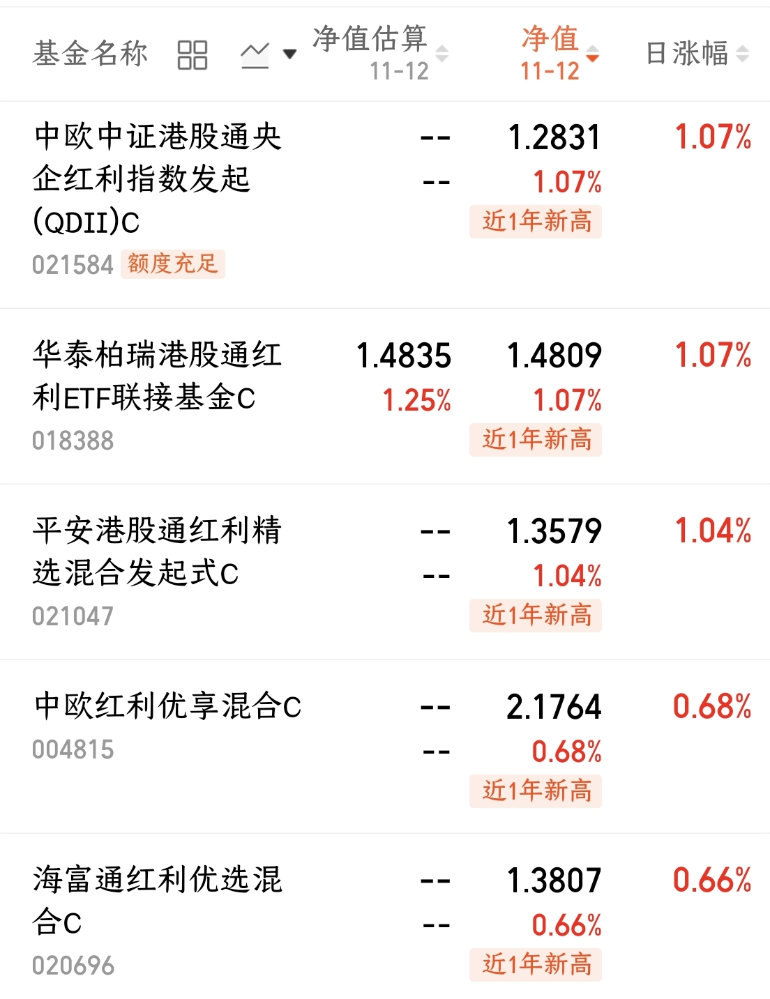 $中欧中证港股通央企红利指数发起(QDII)C(OTCFUND|021584)$已经连续上涨好多天,今天继续上涨1.07%