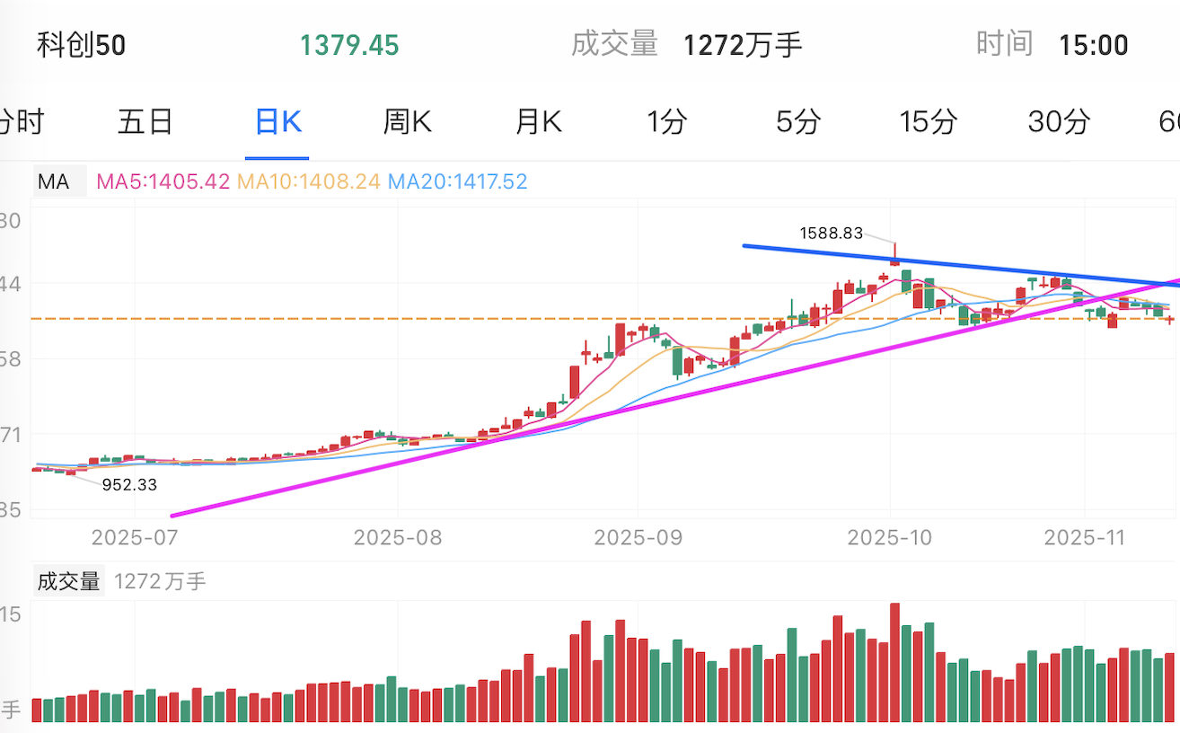 科创50此前一直震荡上行,最近较大幅度回撤,跌破上涨趋势线,目前处于高位盘整形态,目前在前低支撑位挣扎,跌破则此次行情结束。
