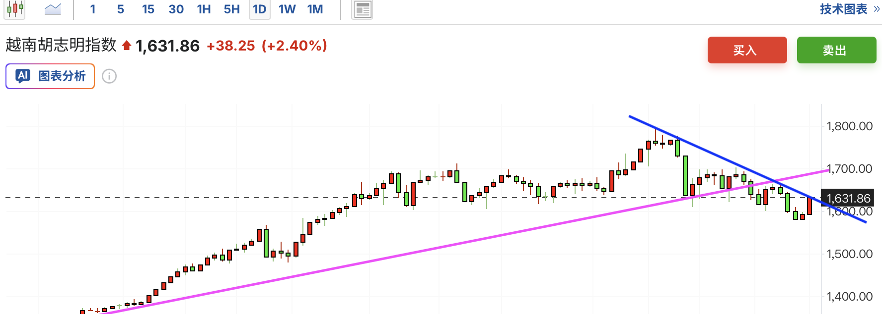 越南指数此前涨幅大,后力竭回调,这几日已经跌破短期上涨趋势线和前低支撑位,趋势已经下行。周三反弹,涨回下跌趋势线,如果突破成功,那么可能再次回升或高位盘整。
