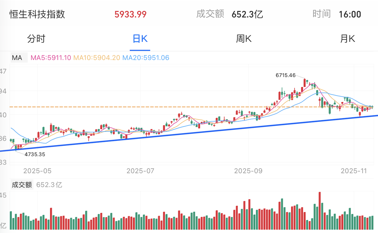 恒生指数和恒生科技近期一直处于横盘震荡期,最近跌回上涨趋势线,周三逆势反弹,守住关键支撑,还不能确定就此回升。